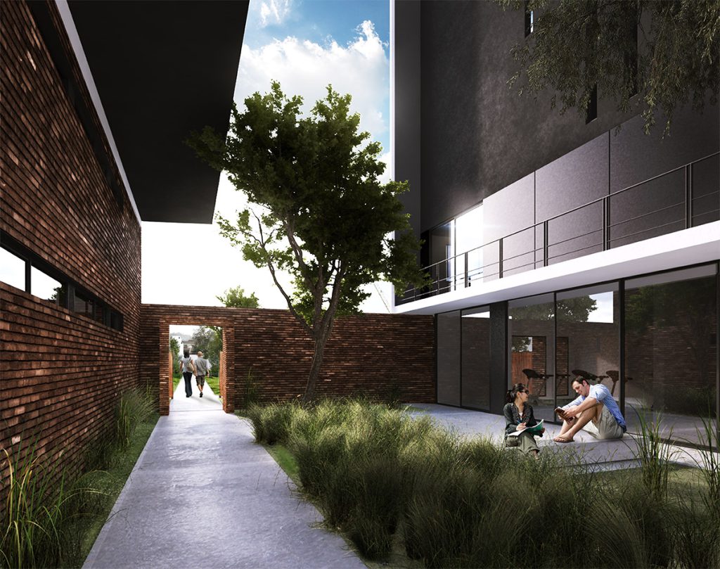 Ambas torres cuentan con bodegas en la planta sótano, y la "torre de estudiantes" alberga la cisterna en este nivel. Tras el control de acceso, una vialidad rodada rodea los edificios, formando una L y proporcionando acceso a los cajones de estacionamiento.