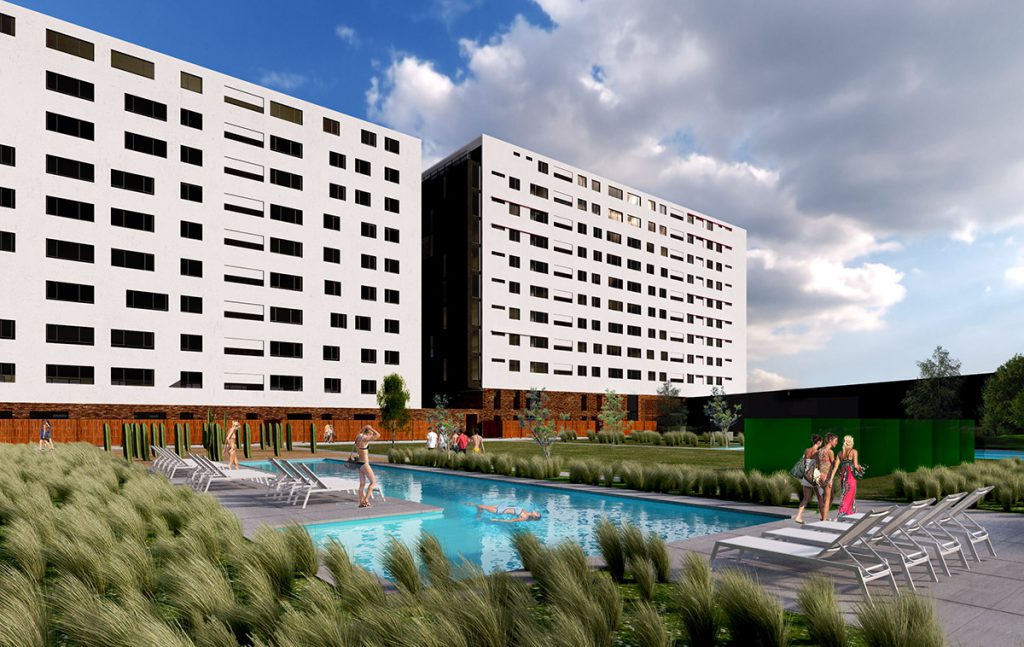 En el centro del predio, se encuentran dos torres residenciales. La primera, enfocada en una audiencia estudiantil, presenta viviendas de 2, 3 o 4 recámaras con áreas de amenidad en planta baja; la segunda torre, destinada a usuarios ejecutivos, ofrece viviendas de 1, 2 o 3 recámaras, con un "business lounge" en el séptimo piso y un gimnasio con patio en planta baja.