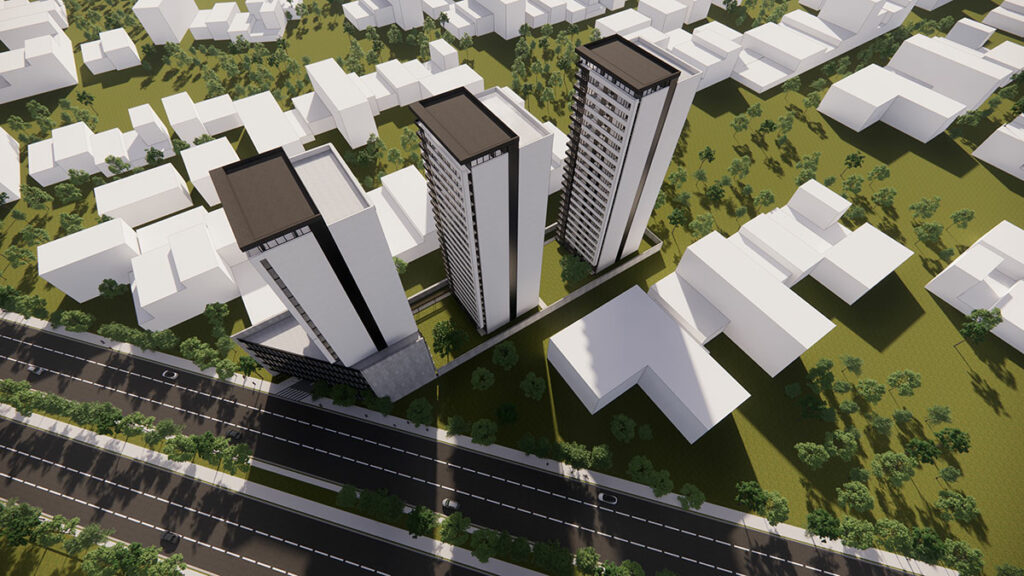 Enfocado principalmente en la vivienda, el complejo alberga tres torres de 20 pisos cada una, con un total de 303 departamentos que ofrecen diversas tipologías con áreas que oscilan entre 50 y 90 metros cuadrados.
