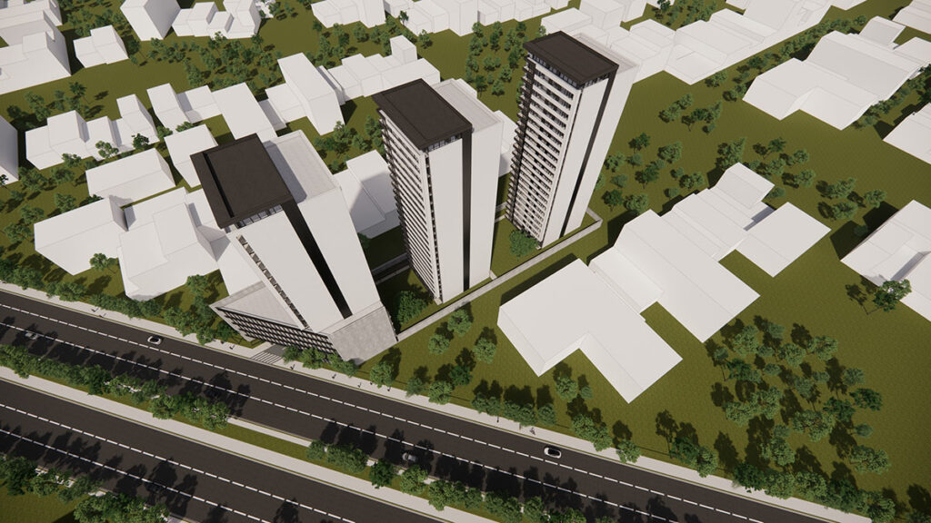 La diversidad de tipologías de departamentos refleja la intención del proyecto de ser inclusivo y adaptarse a las múltiples necesidades de los residentes potenciales. La disposición vertical en 20 niveles por torre busca maximizar las vistas panorámicas, la orientación solar y la calidad espacial en cada residencia.