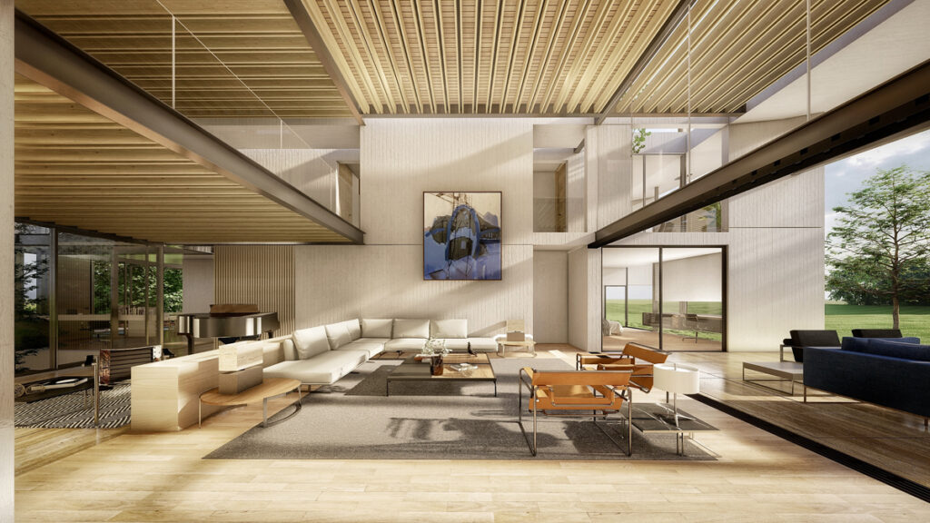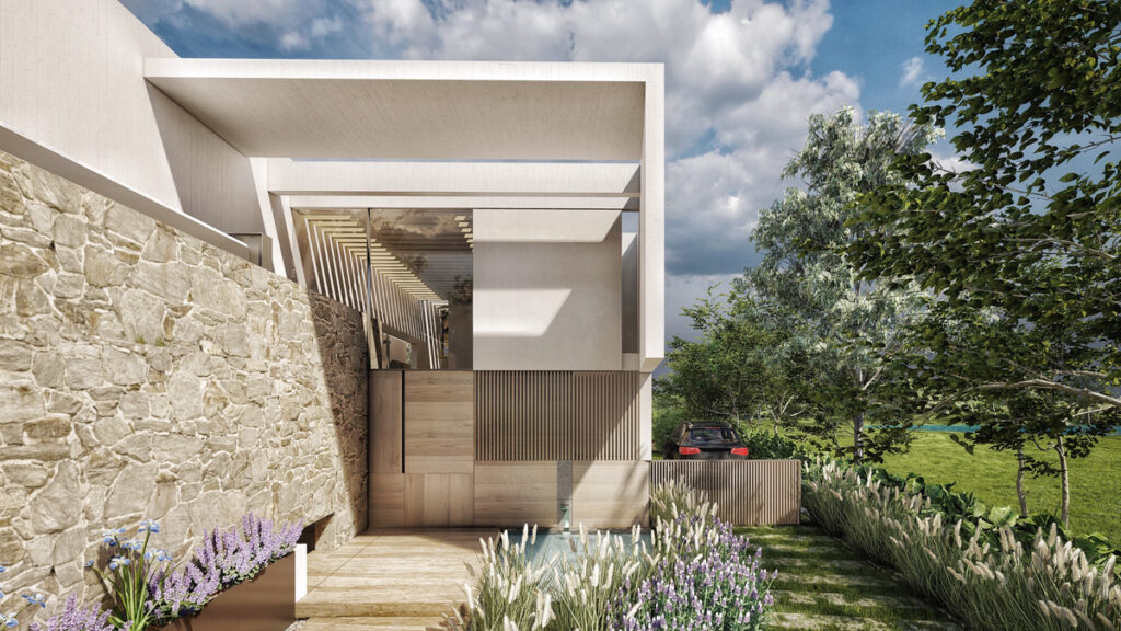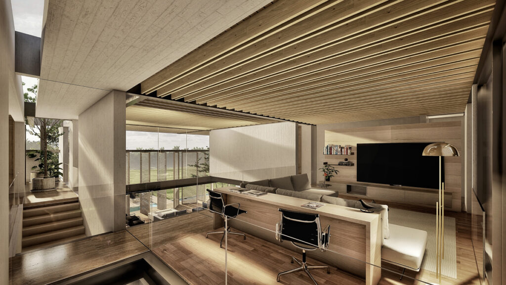 La propuesta arquitectónica maximiza las vistas hacia el entorno natural. El proyecto está organizado en distintos volúmenes que albergan las áreas principales: familiar, pública y de servicio. Estos volúmenes están conectados mediante puentes y pasarelas elevadas que permiten una circulación fluida y eficiente.