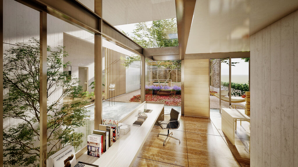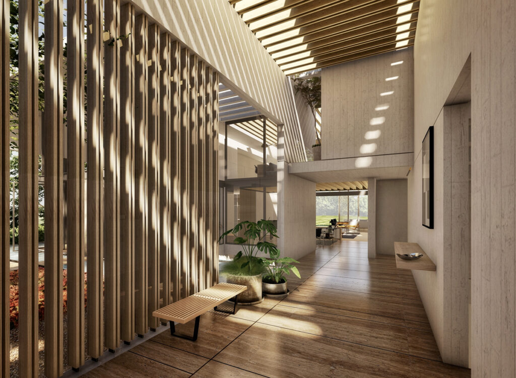 El proyecto incluye múltiples patios y jardines que no solo mejoran la estética y la conexión con la naturaleza, sino que también proporcionan iluminación y ventilación natural a las áreas interiores. Las conexiones verticales y horizontales mediante escaleras y puentes facilitan el acceso a todas las áreas y crean una sensación de continuidad espacial.