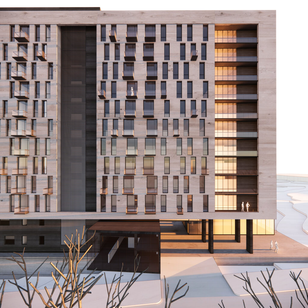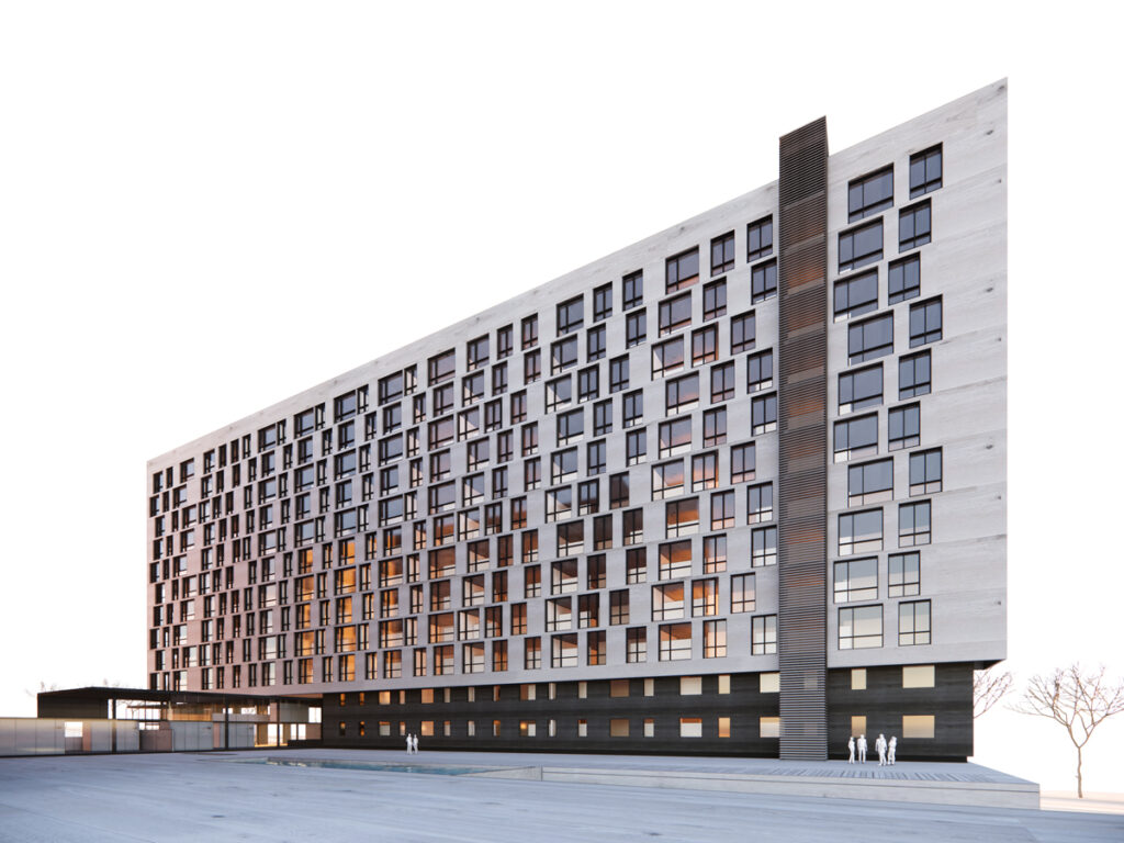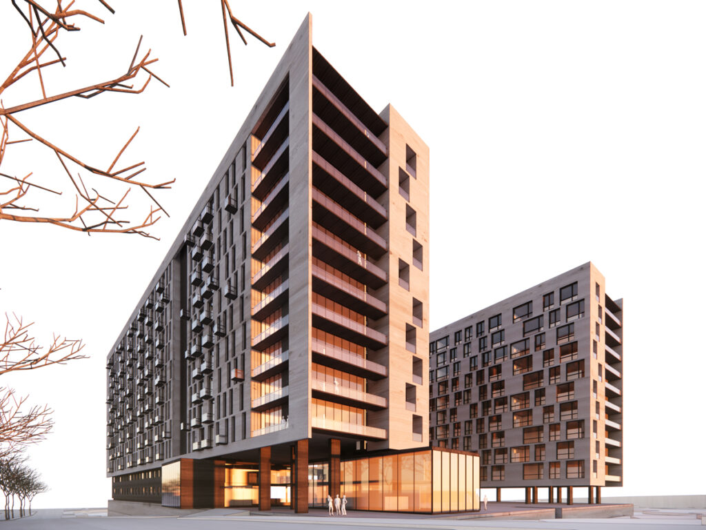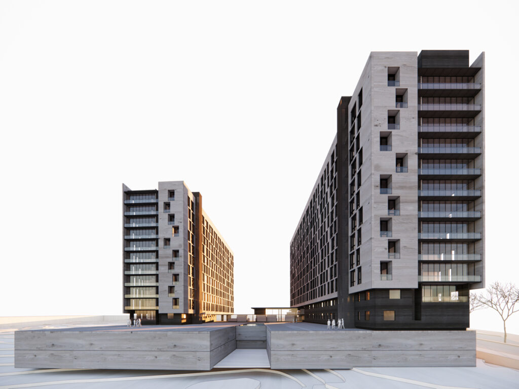 Sobre los estacionamientos, se desplantarán los 11 niveles de viviendas, dispuestos en forma de “C”.