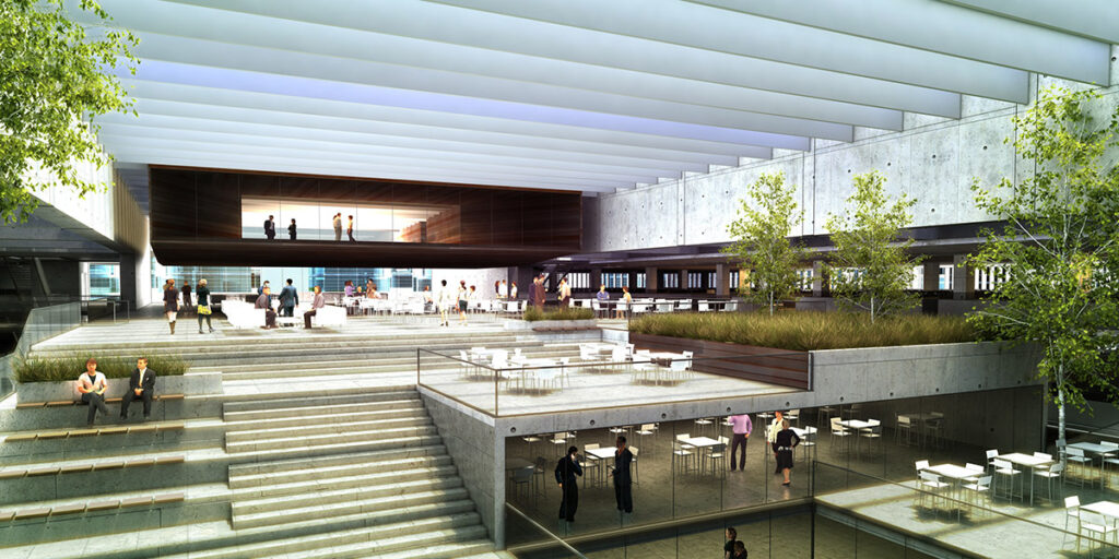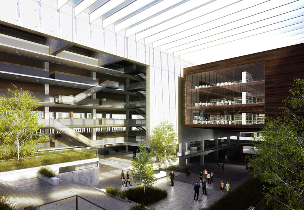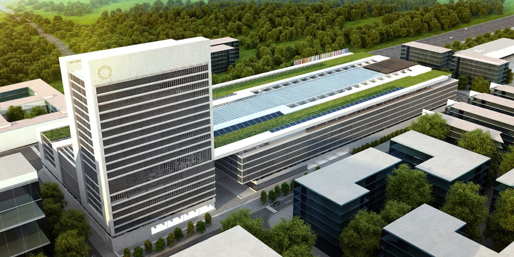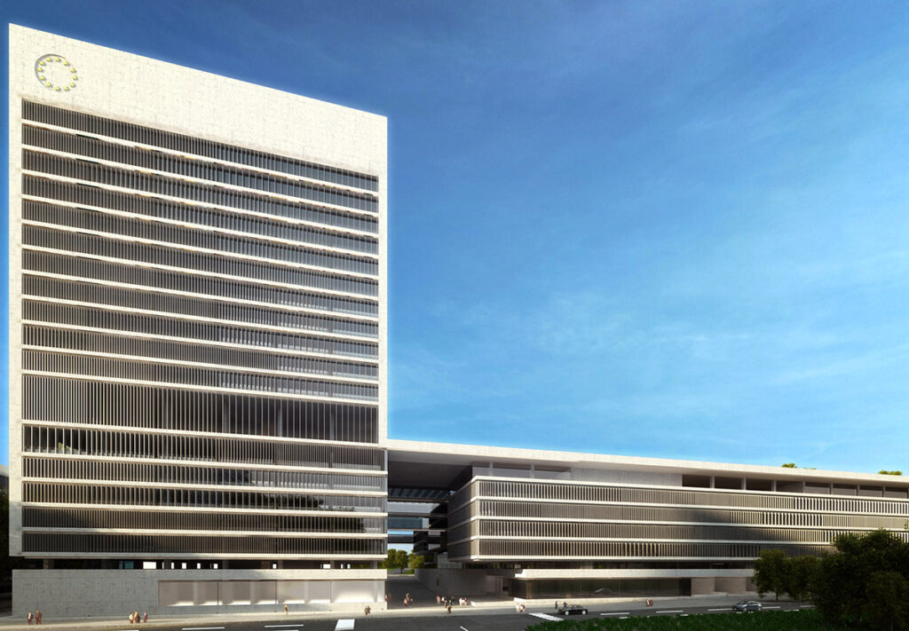 El concurso, desarrollado en colaboración con Estudio Lamela, requiere dividir la construcción en dos partes, comunicadas para operar como una unidad con un solo acceso. Esto crea un pasaje a través del edificio, similar a la Galería Vittorio Emanuele II en Milán, proporcionando un espacio público que permite a las personas comprender la función del edificio. La primera fase del edificio se muestra completamente desde este pasaje, mientras que las terrazas verdes cubren y ventilan el estacionamiento de la segunda fase.