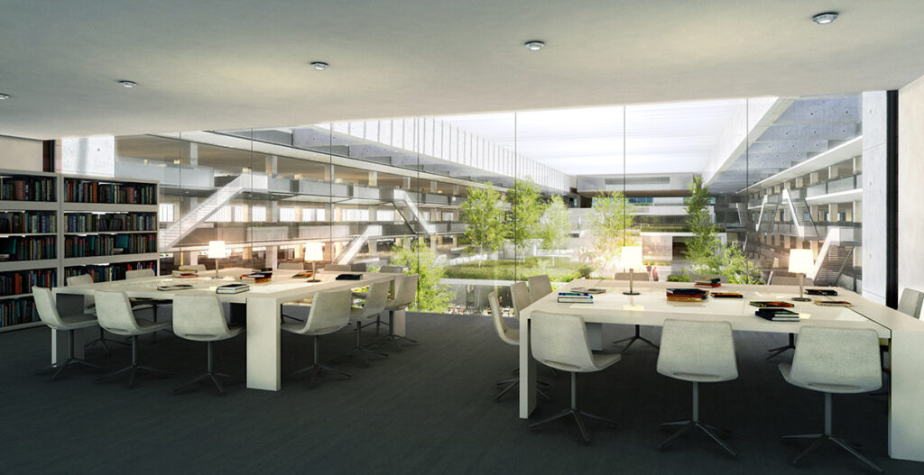El edificio también incluye oficinas, archivos, salas de reunión, instalaciones deportivas y áreas de servicio, diseñadas para maximizar la funcionalidad y el intercambio cultural entre los usuarios.