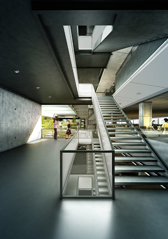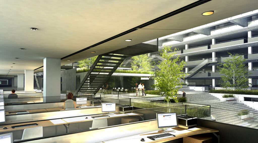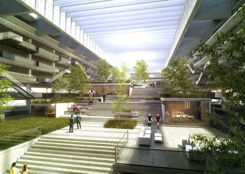 El edificio se divide en tres secciones, con un elemento longitudinal central que alberga todos los usos públicos: una gran plaza escalonada que sirve como punto de encuentro. Los edificios laterales contienen estaciones de trabajo y espacios de reunión. Bajo la gran escalera se encuentran el centro deportivo, piscina, restaurantes, cafetería y áreas de reunión, visibles desde cualquier parte del edificio.