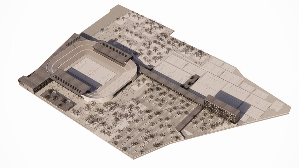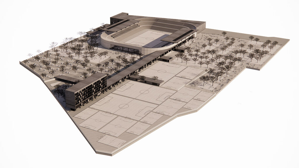 El centro de entrenamiento y la escuela de fútbol se resuelven con una serie de canchas de uso múltiple que complementan la oferta deportiva del recinto. Las oficinas corporativas del equipo se desarrollan en una torre de cinco niveles vinculada a las canchas y zonas de entrenamiento.