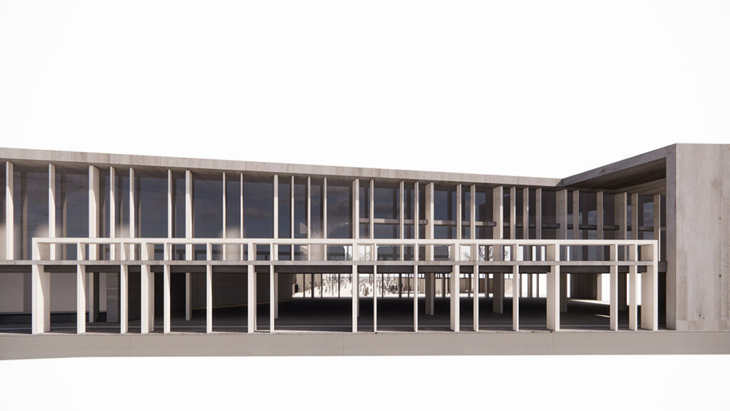 El diseño presenta una estructura de líneas limpias y una combinación de concreto y acero.