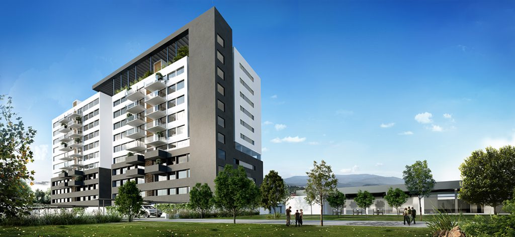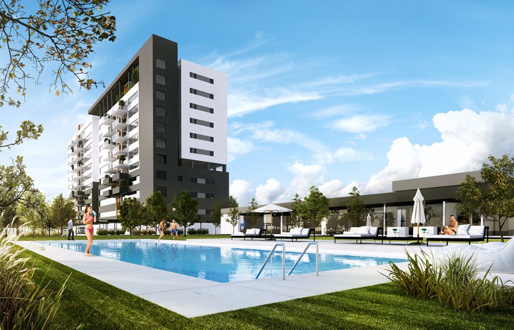 La propuesta arquitectónica incluye dos elementos clave: una torre de viviendas al Este, con una huella de aproximadamente 1,200m² y una altura de 36m distribuida en 12 niveles para albergar 86 unidades; y un edificio de amenidades al Oeste.
