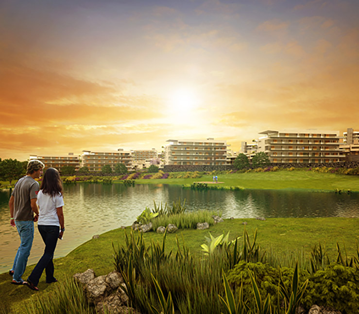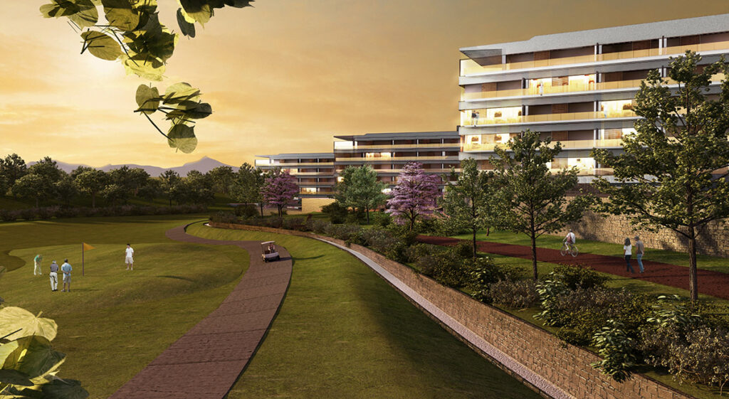 Los edificios plurifamiliares se ubican en dos zonas: una en la parte alta con vistas al campo de golf y las montañas, y otra cercana al campo de golf para maximizar las vistas al área de juego.