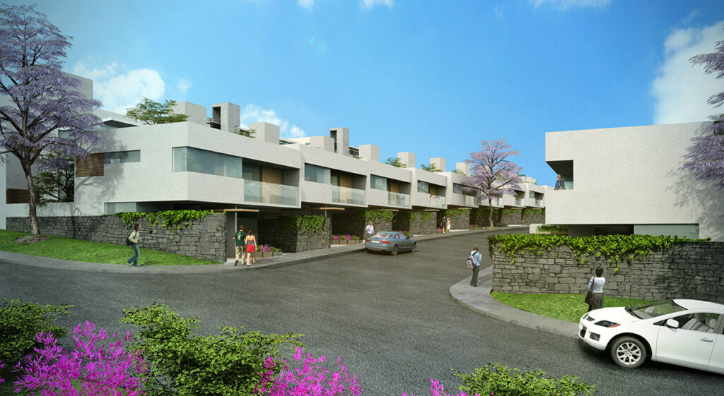 El acceso a cada mini macrolote se organiza mediante un camellón bordeado de árboles, ofreciendo privacidad a las viviendas perimetrales. Vialidades secundarias conectan directamente con cada vivienda, dejando un espacio verde de 2 metros al frente de cada una.