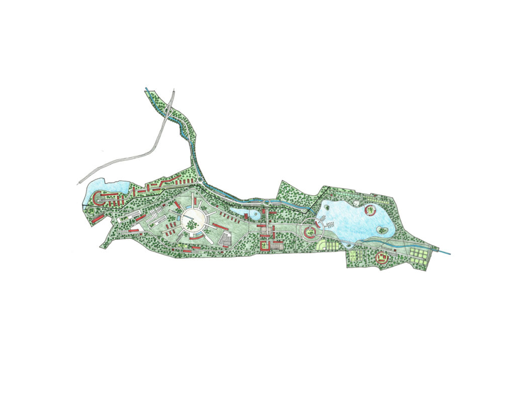 El proyecto se compone de diversas áreas de uso mixto, que incluyen viviendas, espacios recreativos, comerciales, culturales, deportivos y ecológicos, distribuidos para crear una interconexión multifuncional entre ellos. Estas áreas se organizan a lo largo de un eje lineal que recorre la totalidad del predio, distribuyendo las áreas naturales y de esparcimiento alrededor de dos lagos y un río, que actúan como puntos de encuentro a lo largo del desarrollo.