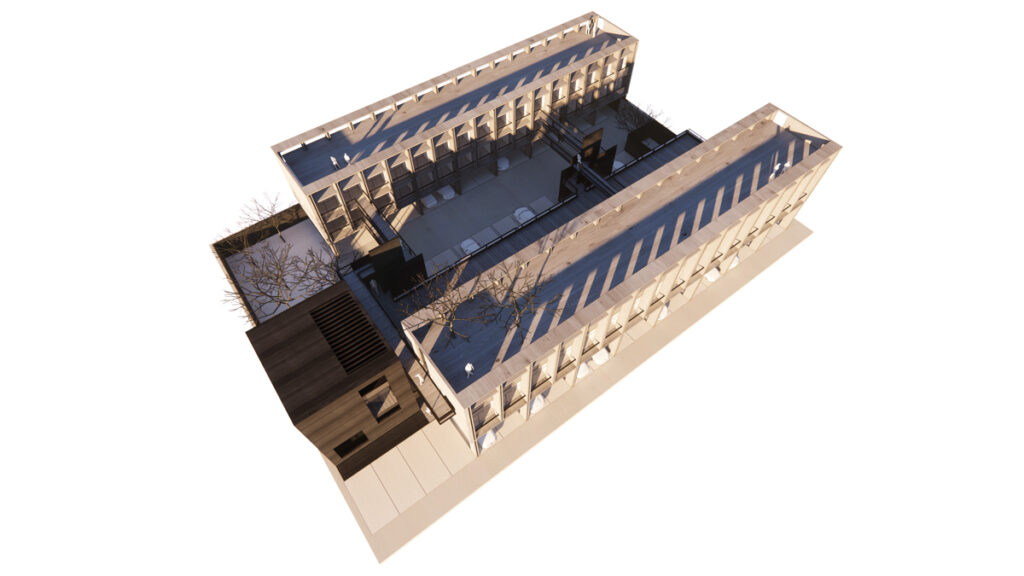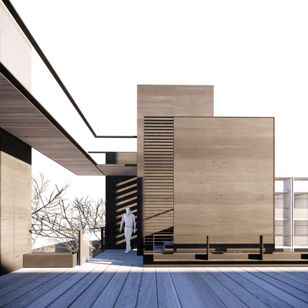 Una parte significativa de la cubierta comercial se destina como terraza común para los residentes, proporcionando un espacio compartido y abierto que mejora la calidad de vida.