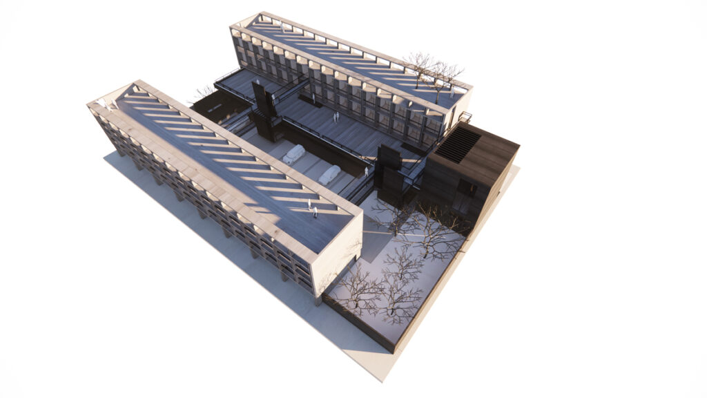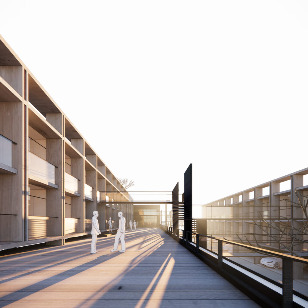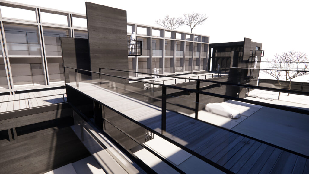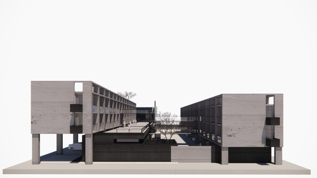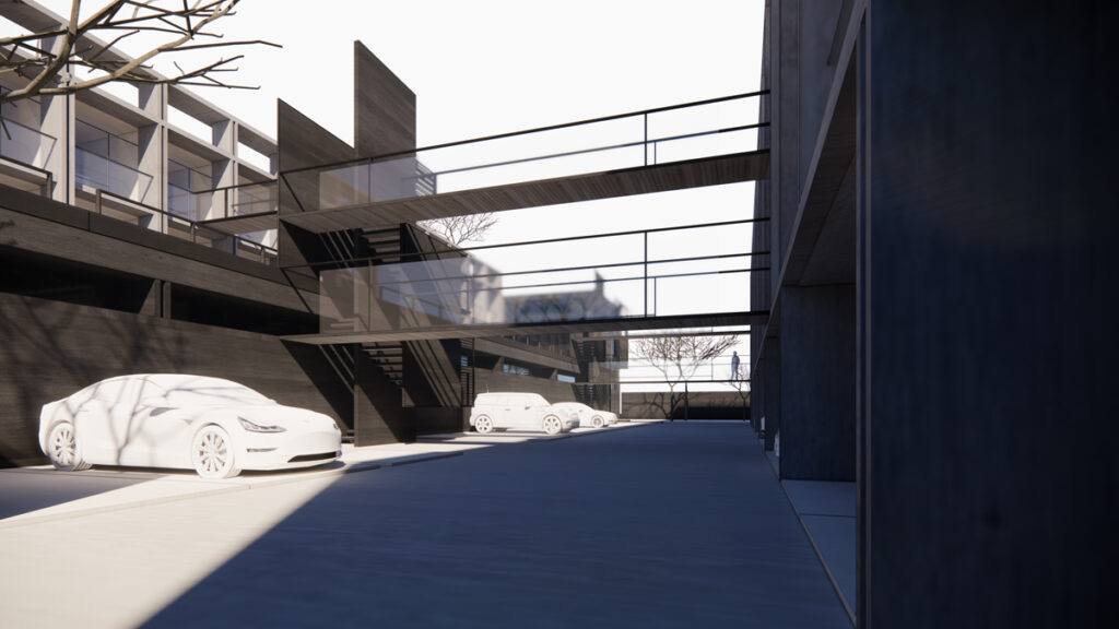 La conectividad entre las diferentes áreas del proyecto se resuelve mediante pasarelas elevadas y escaleras, las cuales facilitan una circulación fluida y eficiente entre los distintos niveles y bloques. Este diseño permite una movilidad cómoda y segura para todos los usuarios.
